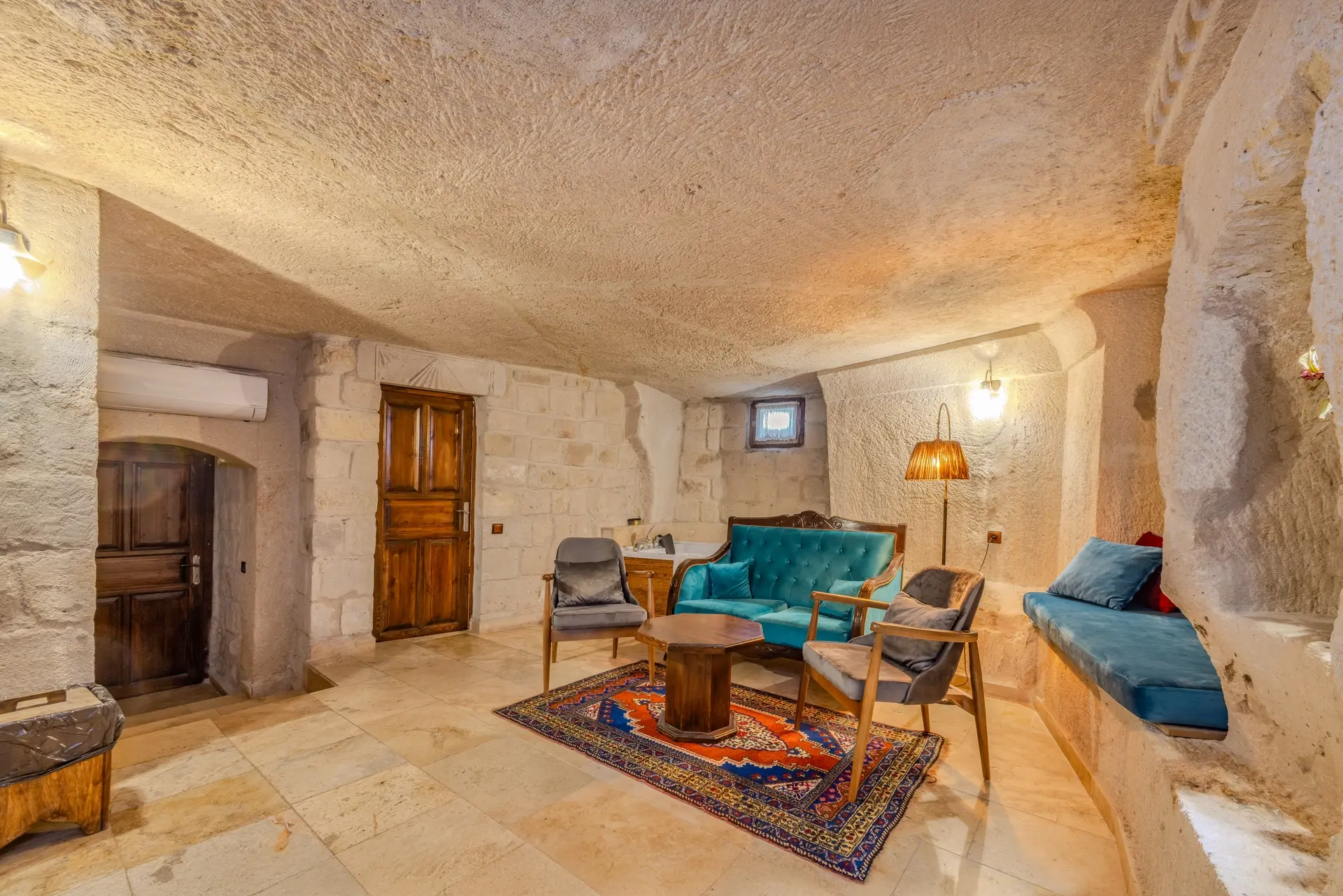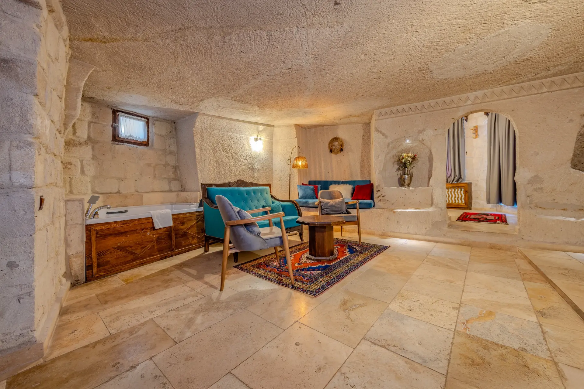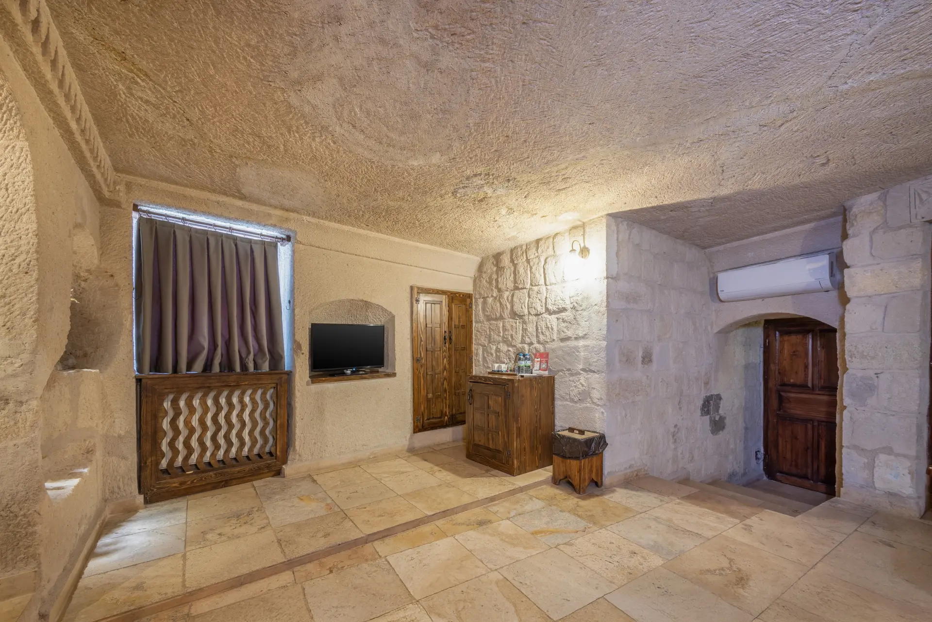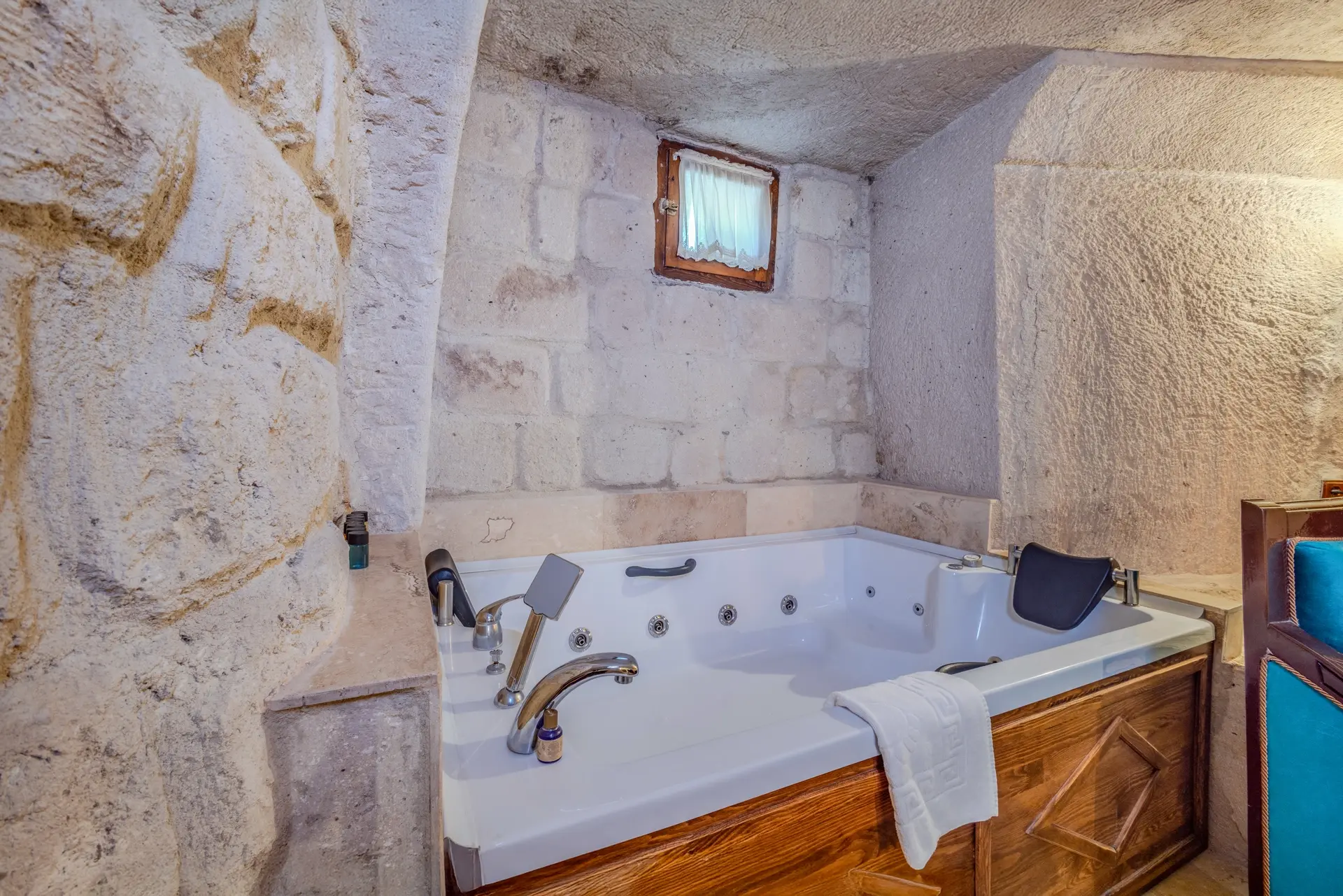 Offering one of the most exclusive accommodation experiences at Castle Cave Hotel, our Room 204 combines luxury and comfort. You can pamper yourself and unwind from the day's fatigue in the room's most remarkable features: a private Turkish bath (hamam) and a jacuzzi. In addition to a comfortable bed, there is an armchair for relaxation and a desk that can be used as a workspace. The room also boasts a private balcony where you can enjoy the fresh air. You can control the room temperature with the air conditioning and organize your belongings with the wardrobe and clothes hanger.